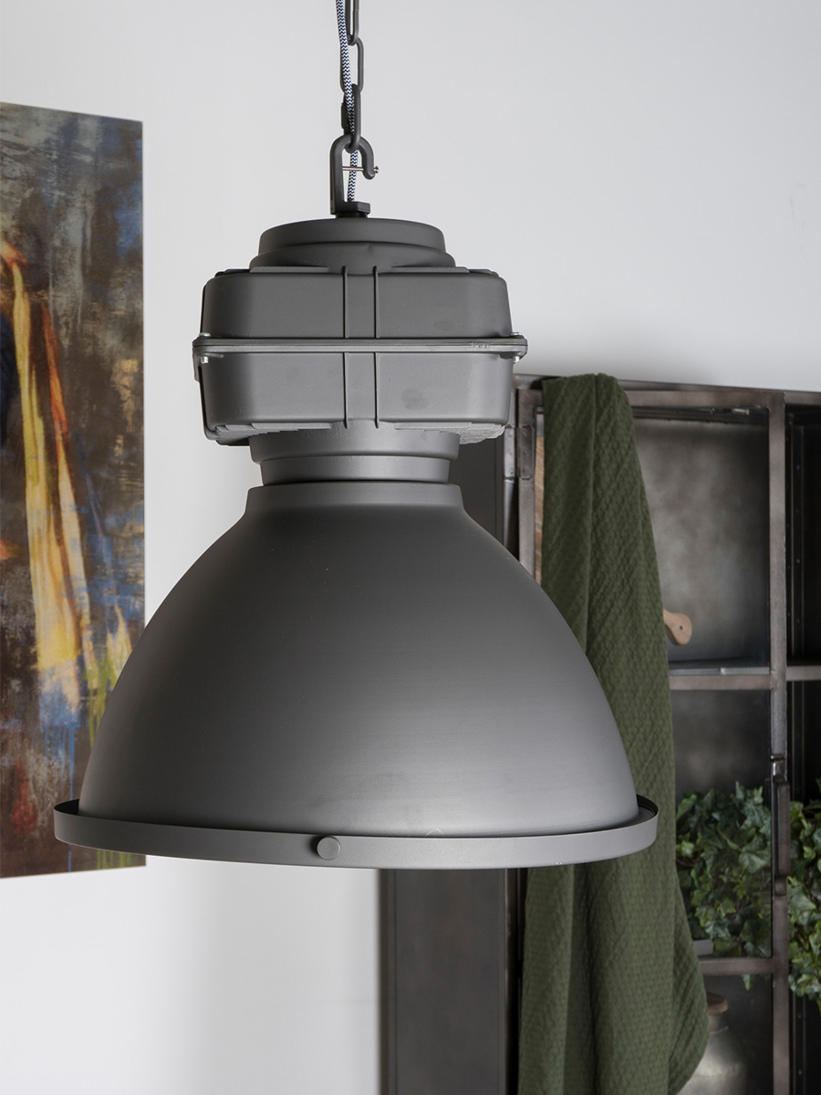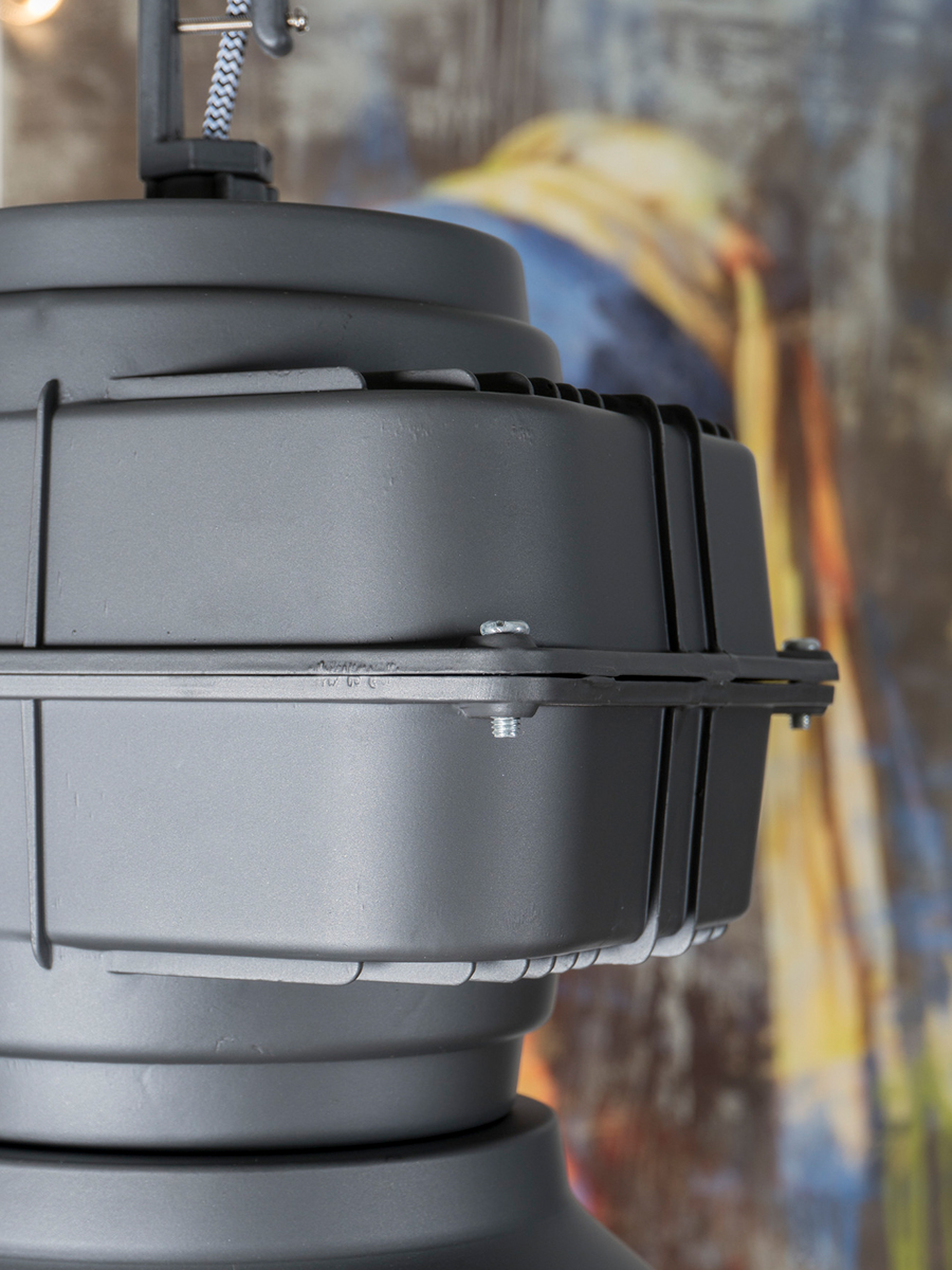 Hanglamp Castor is een grote, robuuste lamp. Castor bestaat uit een grote rondvormige kap die toeloopt naar een gedetailleerde transformatorkast. Deze luster lamp is stoer en geeft je interieur een industriële touch. De lamp is voorzien van een robuuste ketting en een mooi strijkijzerkoord. Hanglamp Castor is leverbaar in verschillende kleuren: Black en Burned Steel.