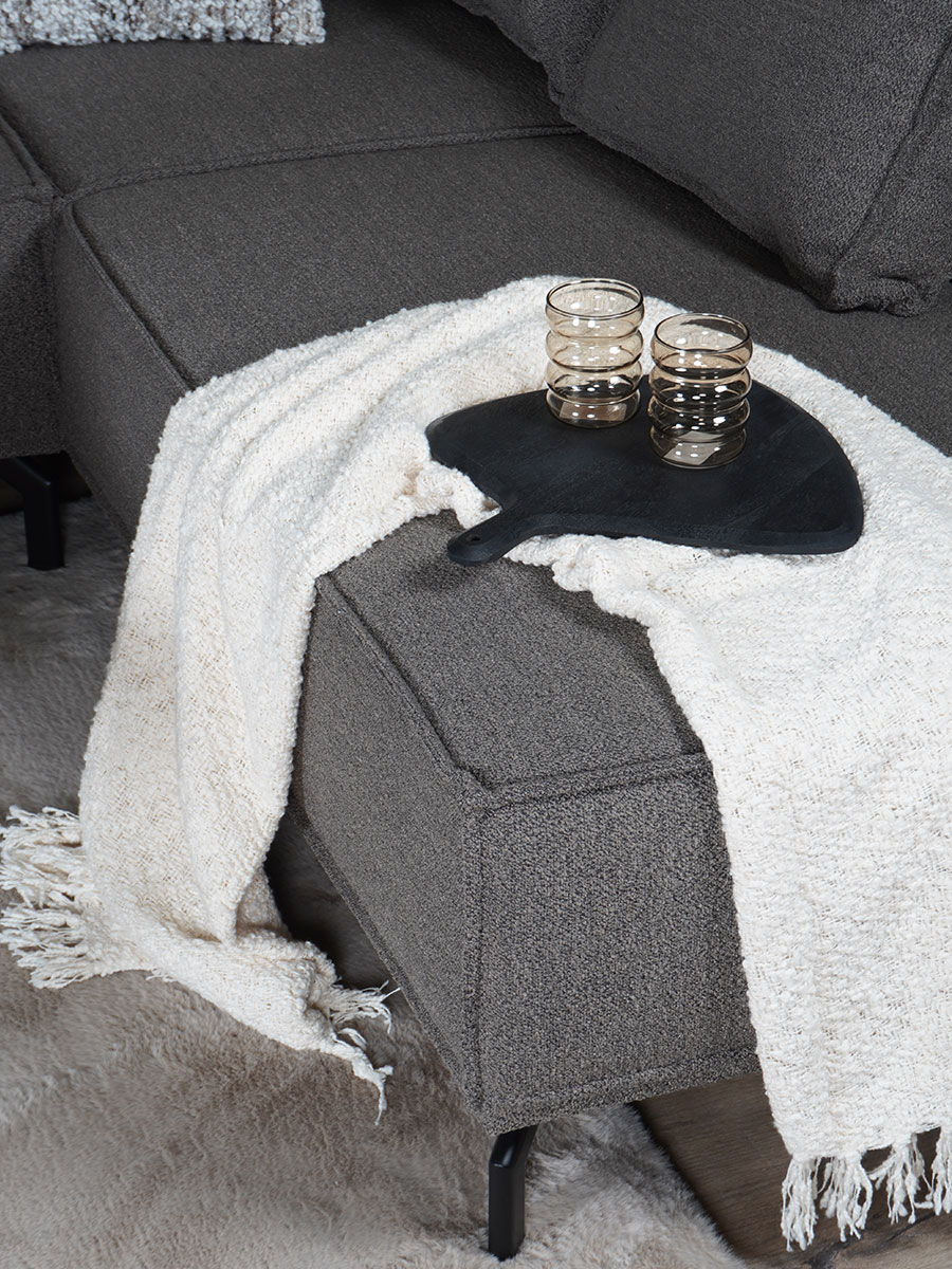 Hoekbank Ron heeft een rijke uitstraling door de comfortabele, losse rug- en zitkussens. Bank Ron biedt genoeg plek voor het hele gezin en dankzij de bouclé stof past deze eigentijdse ribbank in iedere woonruimte! De bouclé stof heeft een mooie uitstraling en voelt heerlijk zacht aan. De stof is zeer sterk en daarom geschikt voor intensief woongebruik.De bank is vervaardigd met een stevig vuren frame en spaanplaat, en is uitgerust met nosag-vering en koudschuim voor optimaal comfort.