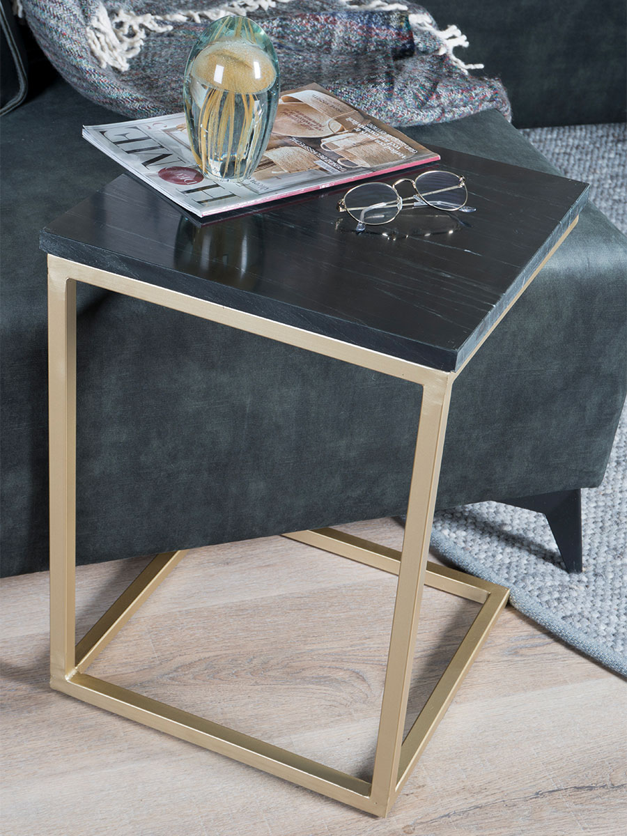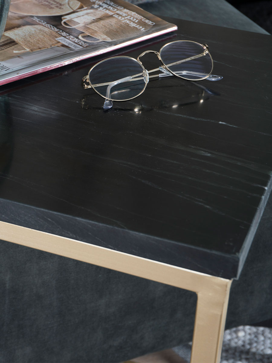 Op zoek naar een luxe en stijlvolle bijzettafel? Dan is bijzettafel Mitch perfect voor in jouw interieur! Het marmeren blad is 2 cm dik en heeft een mooie glas. De combinatie van het gouden metalen frame en het zwart marmeren tafelblad, geeft deze bijzettafel een luxe uitstraling. Het materiaal marmer is een zeer sterke steensoort en daarnaast gemakkelijk schoon te houden. De tafel heeft een open zijde, zodat hij makkelijk over de zitting van de bank of fauteuil geschoven kan worden. Met Mitch heb je je spullen binnen handbereik. Ideaal om te gebruiken voor je laptop of iPad, maar ook voor een kopje koffie, een goed boek of een fijn tijdschrift! Deze bijzettafel wordt gratis thuisbezorgd. Na ontvangst kan je de tafel direct een mooie plek in huis geven. De tafel is namelijk al in elkaar gezet. Mocht de bijzettafel na ontvangt toch geen match zijn met jouw interieur, is het uiteraard mogelijk om deze te retourneren. Afmetingen: 40 x 40 x 54 cm.