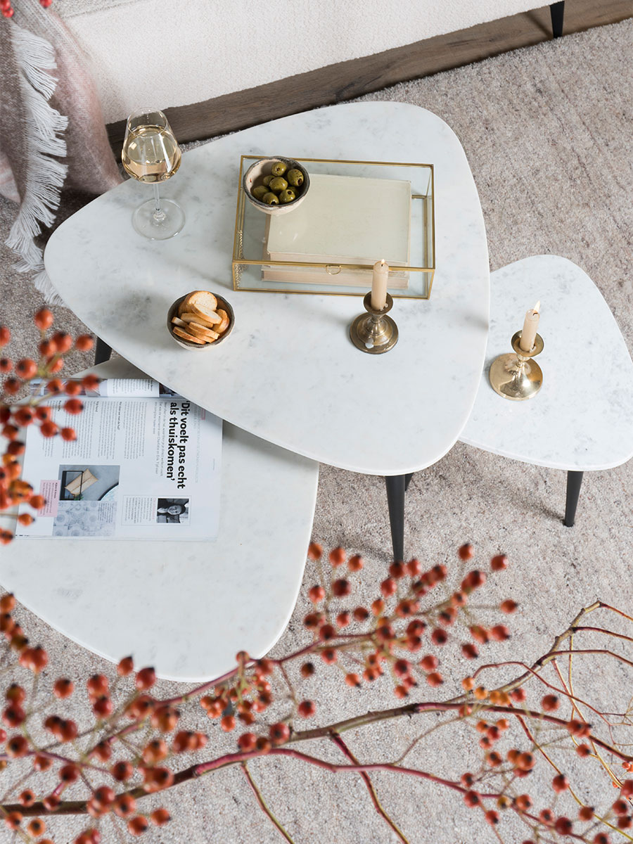 Salontafel Milou heeft een kiezelvormig blad en zorgt voor een verfijnde sfeer in jouw interieur! Kenmerkend is het witte marmeren blad en de slanke metalen poten. Tafels met een organische vorm zijn erg populair en dat is goed te begrijpen. Is het geen pareltje? ✓ Kiezelvormige salontafel ✓ Wit marmer ✓ 3 metalen poten ✓ Ook gaaf als set! ✓ Verkrijgbaar in drie maten