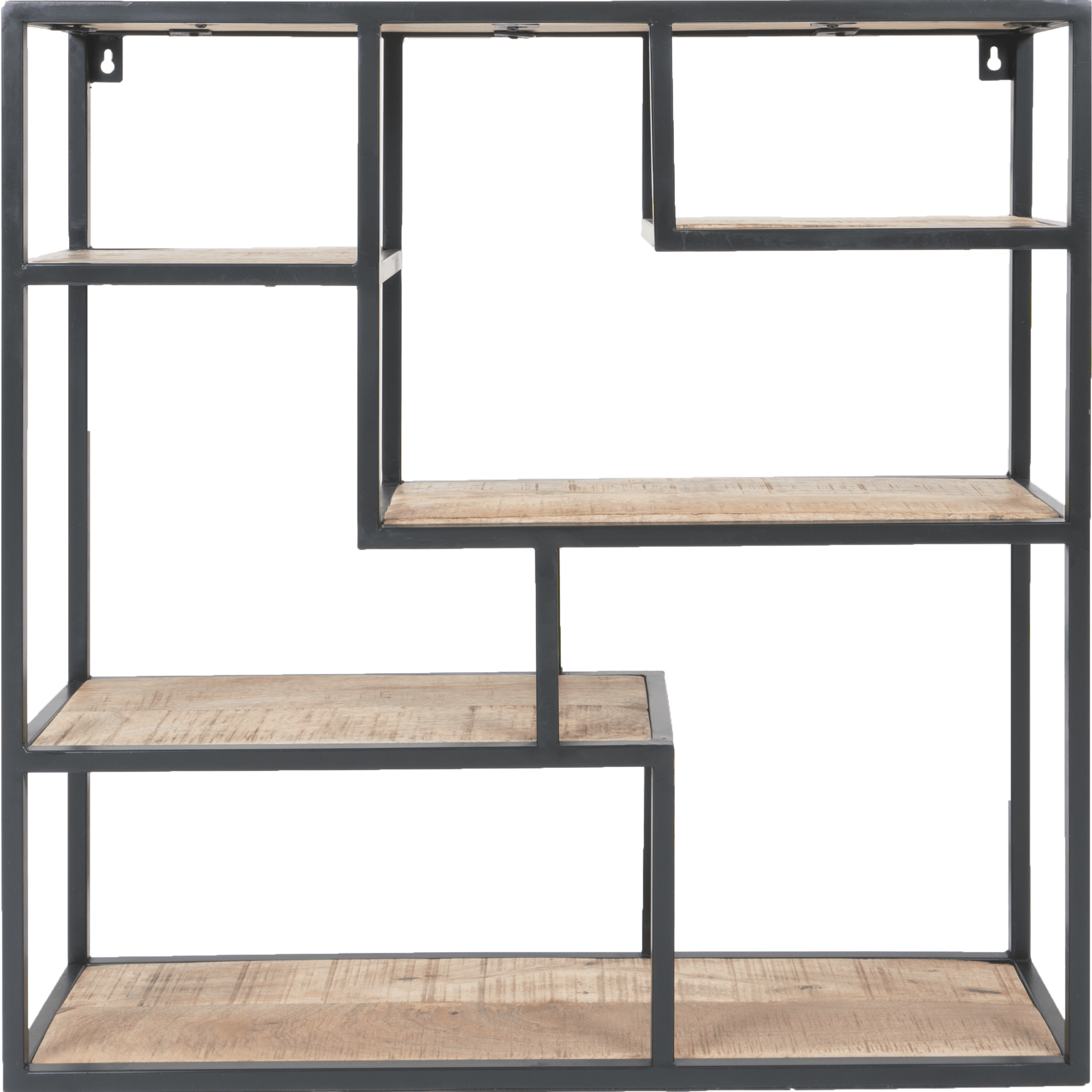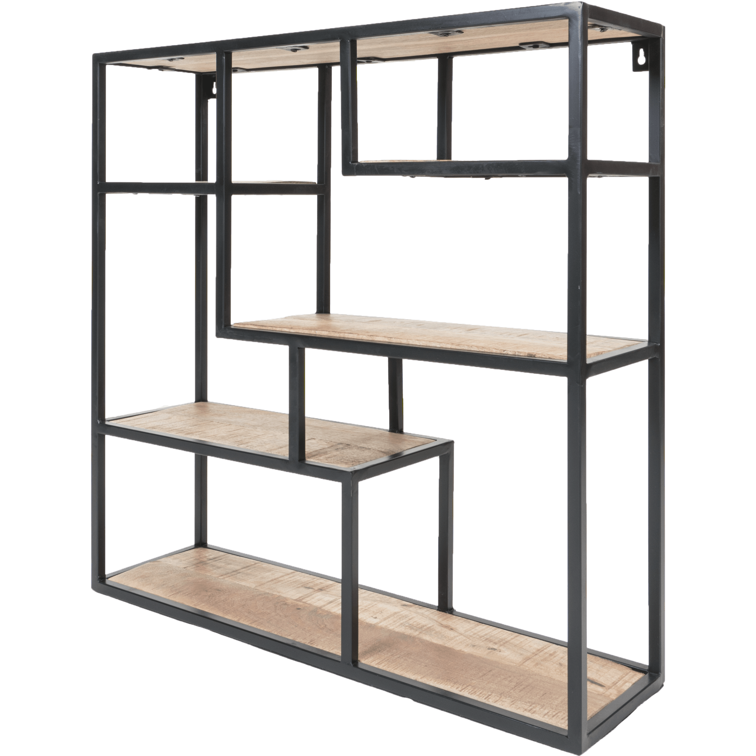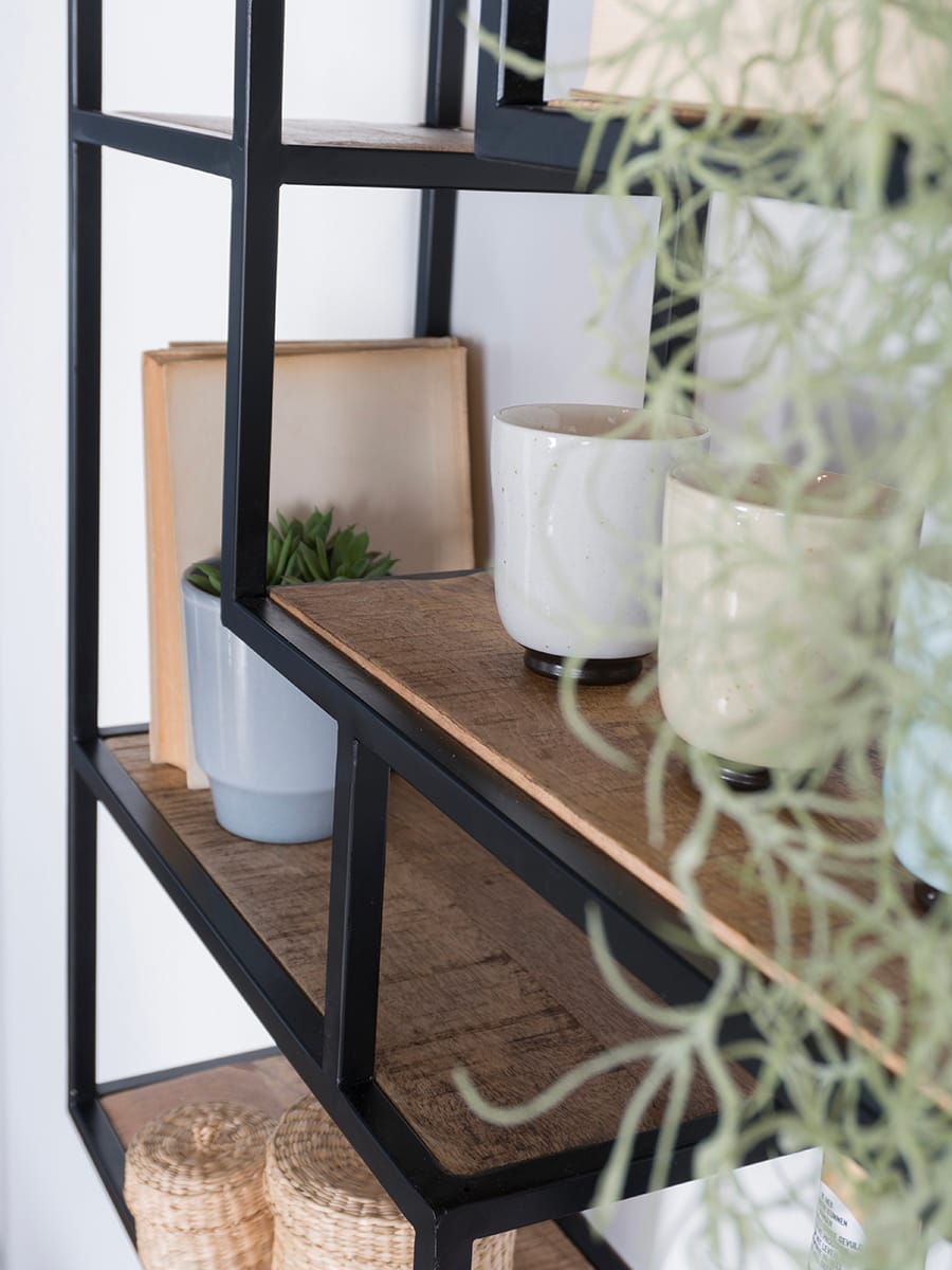 Vrolijk de muur op met wandrek Huub. Door de verspringende vakken heeft het wandrek een speelse uitstraling. Het rek bestaat uit 6 verschillende vakken en het metalen frame in combinatie met de mangohouten planken geeft een stoere, industriële look. Perfect om te decoreren met verschillende soorten accessoires zoals planten, kaarsen en fotolijstjes. Huub is ideaal om je mooiste spulletjes uit te stallen, maar bijvoorbeeld ook erg handig in de keuken voor verschillende specerijen en kruiden. Wandplank Huub is door middel van twee bevestigingsogen eenvoudig aan de wand te monteren en kan een maximaal gewicht van 30 kilo dragen.