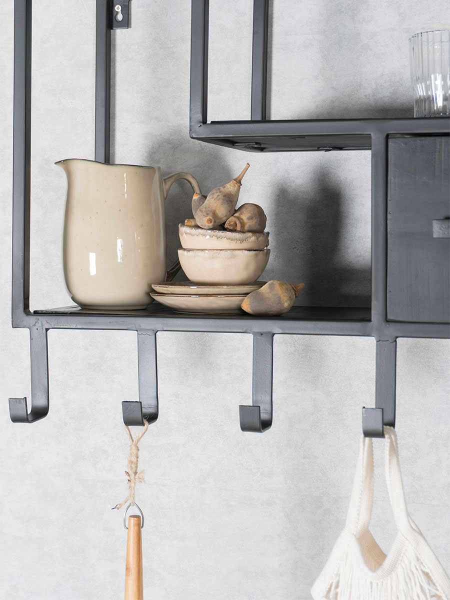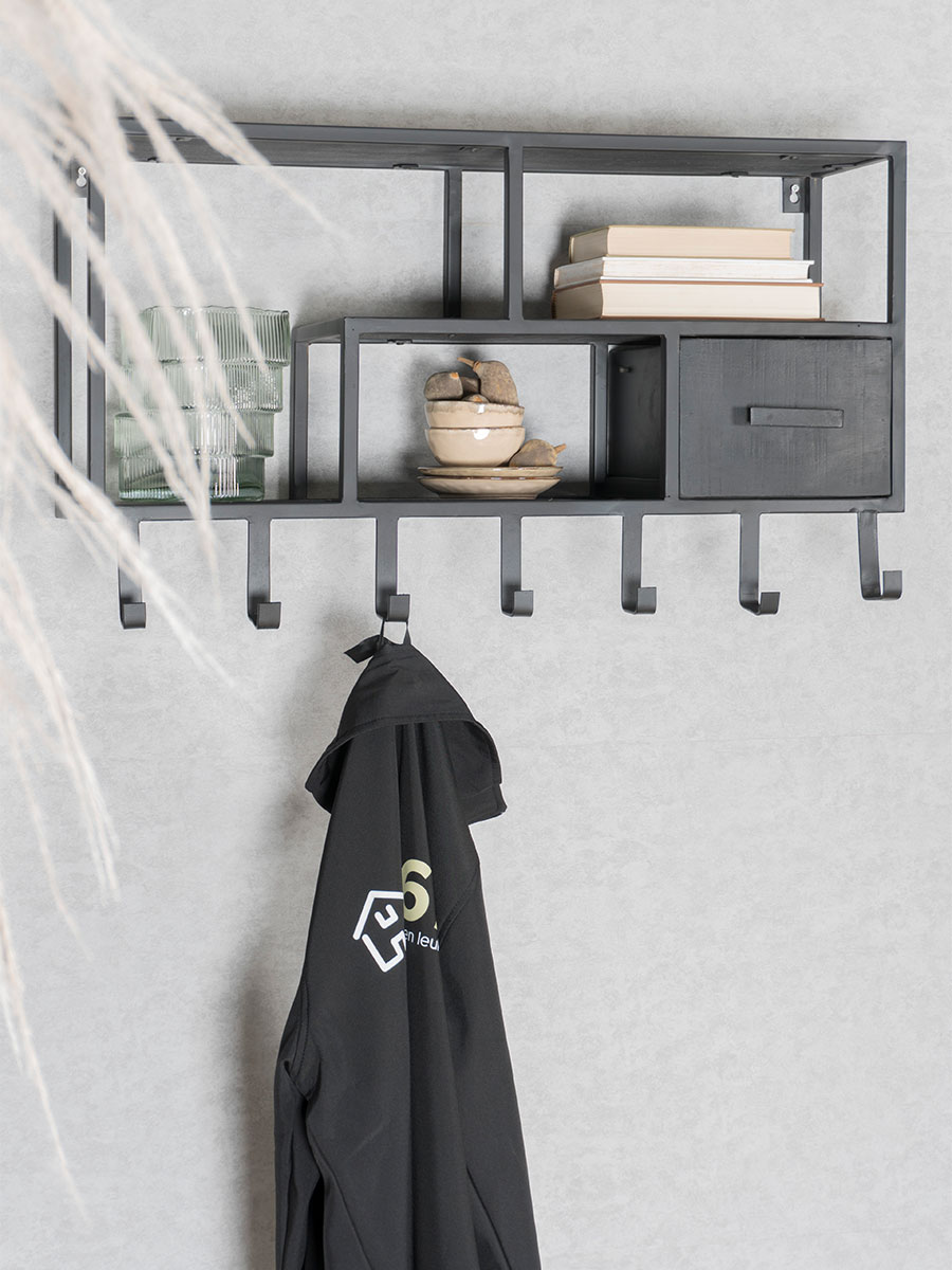 Een mooie wandkast is niet alleen praktisch (want: extra opbergruimte!) maar geeft ook een gezellige uitstraling aan een lege muur. Show je favoriete items aan de zeven haken of geef jouw spullen een plekje zodat je alles in één oogwenk terugvindt! Onderhoud Mangohout heeft in het algemeen weinig onderhoud nodig en is behandeld tegen vocht en vlekken. Wij geven echter geen garantie op het eventueel ontstaan van oneffenheden. Om beschadigingen, vlekken en kringen te voorkomen, raden wij aan om onderzetters en/of viltjes te gebruiken.